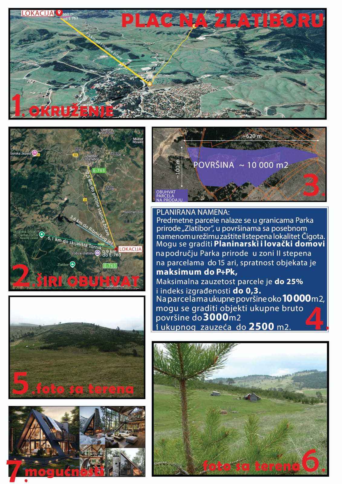 Ova velika parcela na Zlatiboru, u području Ljubiša i Čigote, predstavlja izuzetnu priliku za investitore. Zemljište se nalazi u parku prirode 2. i 3. kategorije, gde je, u skladu sa Generalnim planom, dozvoljena gradnja planinarsko-šumskih kompleksa i kućica od prirodnih materijala poput drveta i kamena. Za gradnju je neophodna izrada urbanističkog projekta uz saglasnost Uprave za zaštitu prirode.
